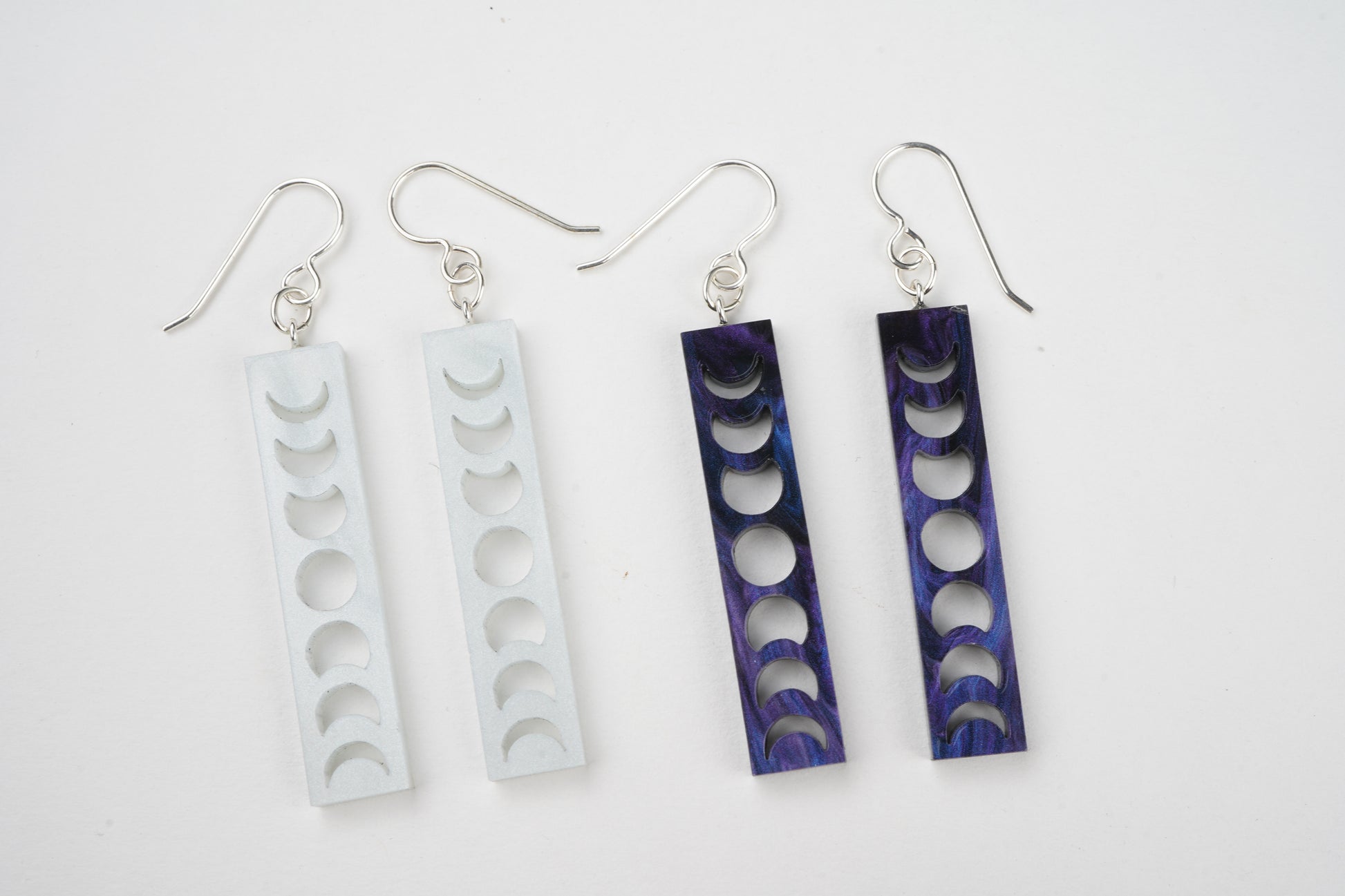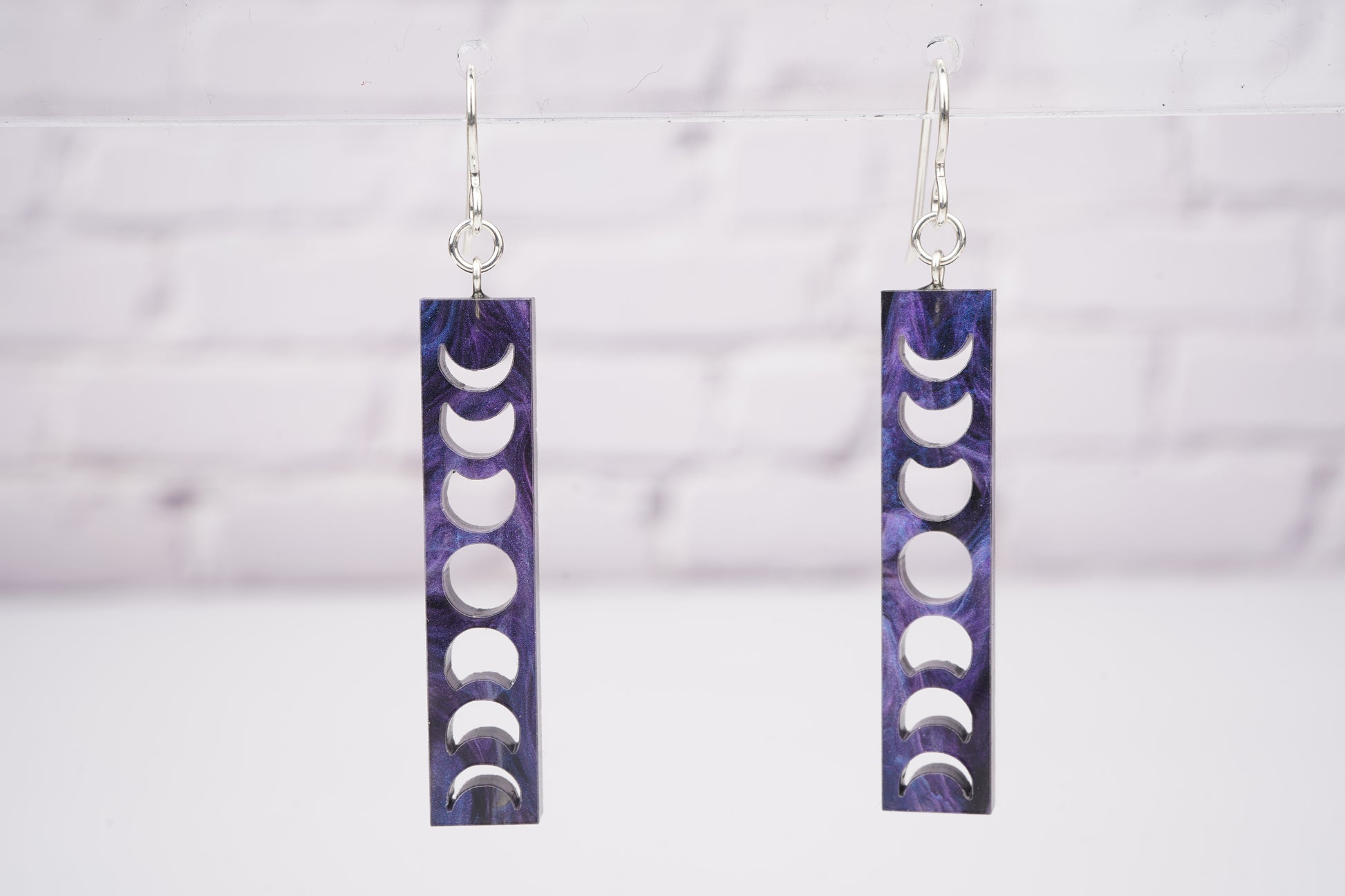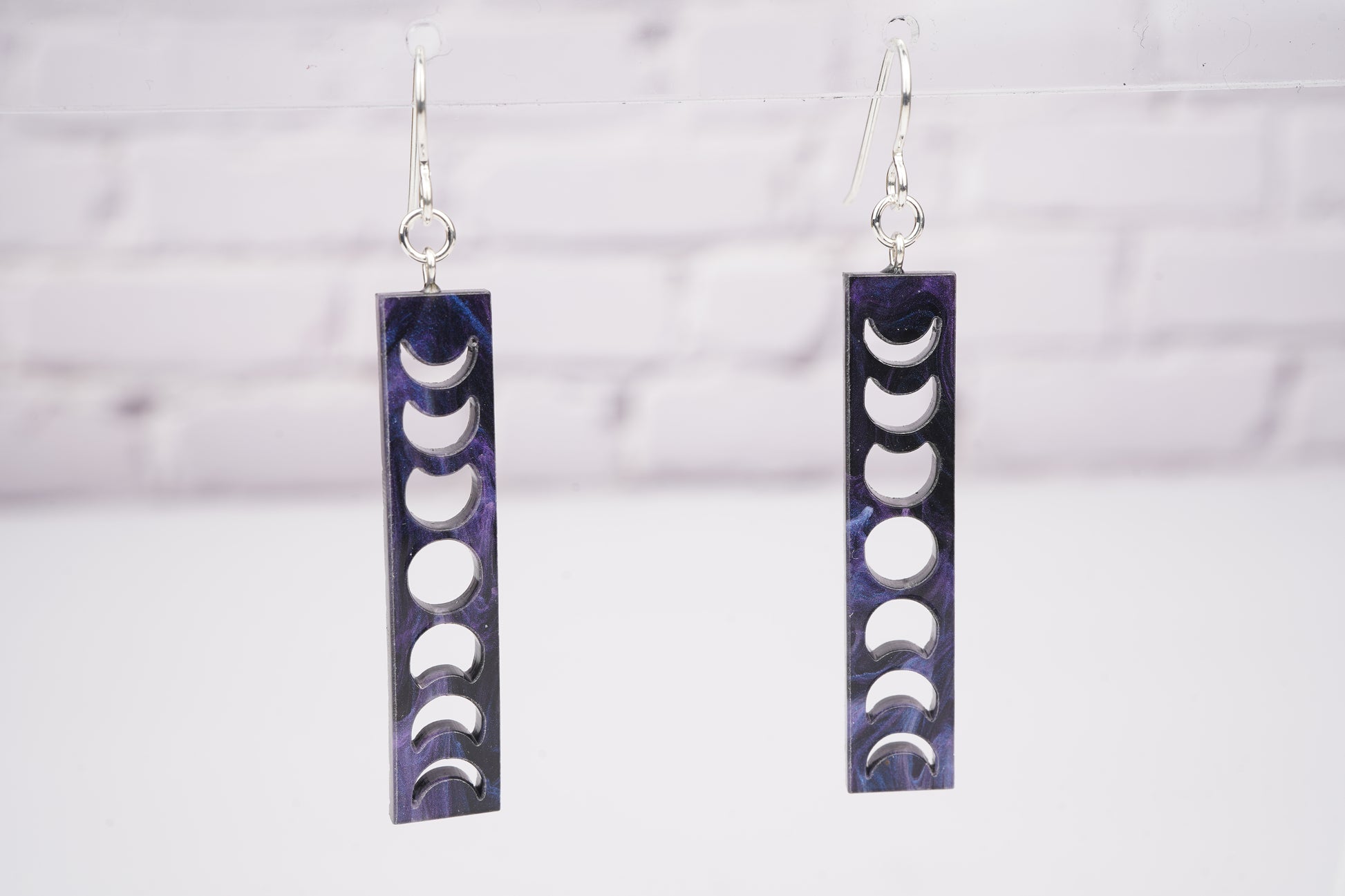Laser cut acrylic moon phases dangle earrings, in a dark blue, purple and black blended swirl galaxy color or a pearlescent white swirl color, both glossy acrylic. Fun, lightweight earrings, great for your witchy friend, your inner moon witch, Halloween, or day to day wear. Sterling silver rings and ear wire, nickel and lead safe. 1 3/4"x 3/8” x 1/8" thick approximately.