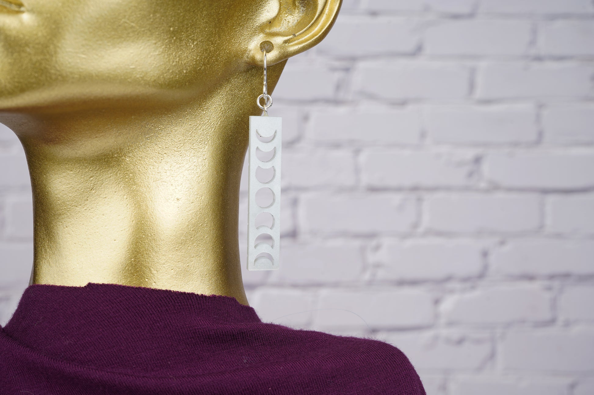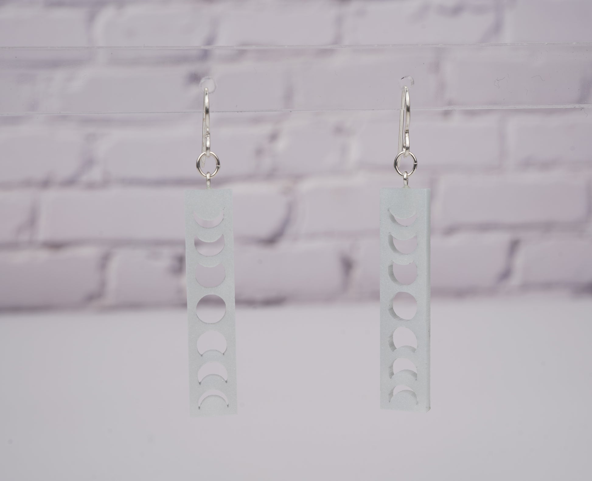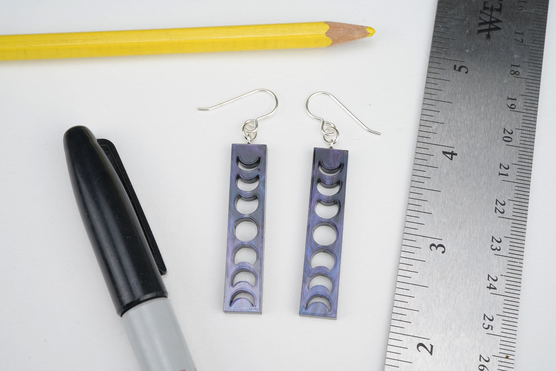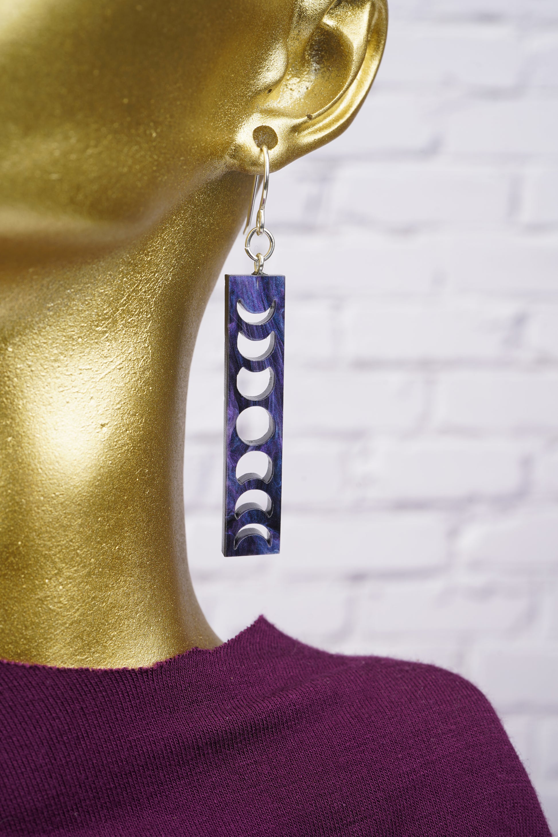 Laser cut acrylic moon phases dangle earrings, in a dark blue, purple and black blended swirl galaxy color or a pearlescent white swirl color, both glossy acrylic. Fun, lightweight earrings, great for your witchy friend, your inner moon witch, Halloween, or day to day wear. Sterling silver rings and ear wire, nickel and lead safe. 1 3/4"x 3/8” x 1/8" thick approximately.